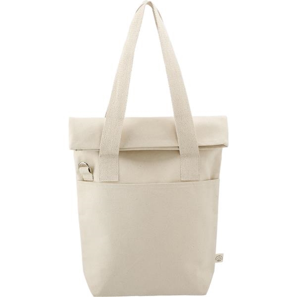 This unique-styled tote is a great fit for the practical wearer. The thick-strapped design makes this eco-friendly bag easy to carry while the fold-down top protects your belongings. This is also an EcoSmart® product and its purchase contributes to the giveback to eco-conscious nonprofits.