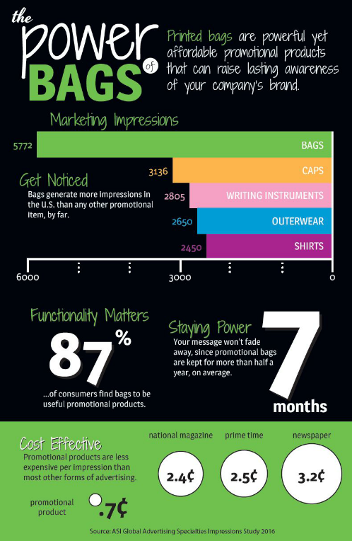 Printed bags are one of the most powerful yet affordable categories of branded merchandise. Bags raise lasting awareness of your company's brand. Just a single bag can generate 5,772 marketing impressions in its average 7 month lifetime. Bags generate more impressions in the U.S. than any other promotional product, by far. Functionality matters when choosing the right solution for your brand. And 87% of consumers find bags to be useful. Think of it as a real-life product placement that only costs you .7 cents per impression!
